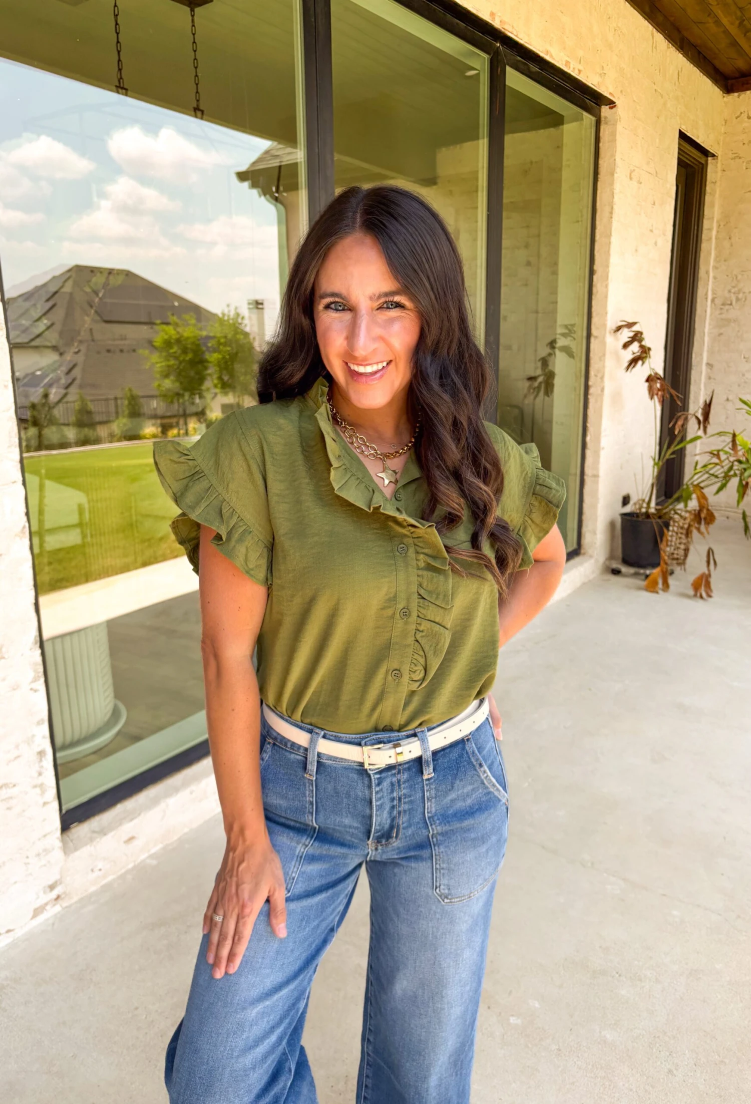 A little ruffle goes a long way—and this olive top is proof! With a flattering button-front silhouette and soft textured feel, it’s perfect for layering or wearing solo on crisp autumn days. Toss it on with jeans or a midi skirt and call it your new seasonal staple.