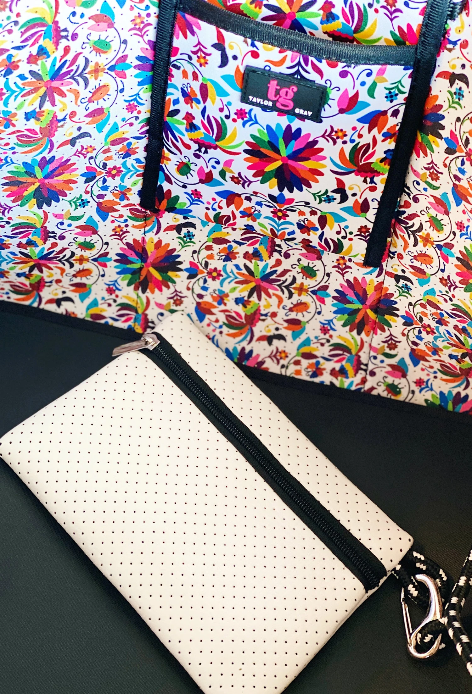 Ole’ señorita! We love all things Mexico including this bag with traditional and Otomi embroidered patterns! The Marissa Neoprene Tote is the first of it’s kind and a nod to the popular Mexican embroidered blouse. The interior lining is our favorite colorful Otomi pattern which originates from Oaxaca, Mexico. This tote is adorned with a fabric embroidered panel with a traditional ruffle down each side. The inside of the tote features the colorful Otomi pattern that complements the exterior fabric panel. Extremely lightweight, the tote includes a white removable privacy pouch with a wristlet strap that will also keep you organized while on the go.