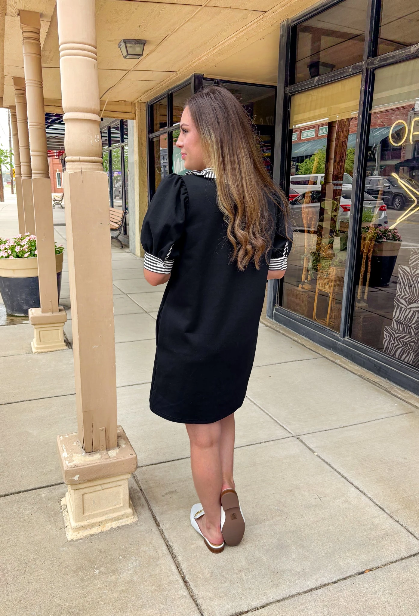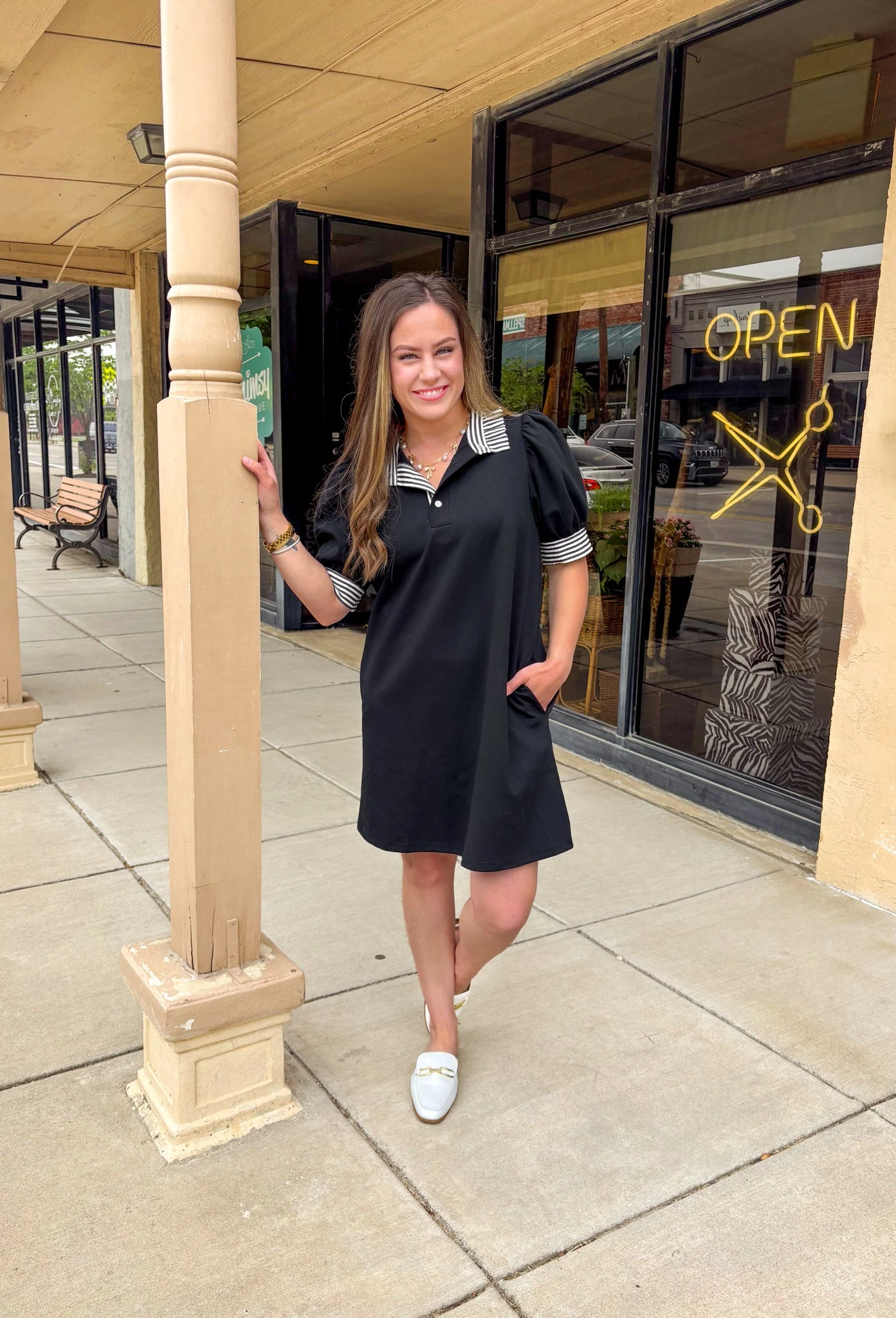 This black short sleeve polo dress by Entro brings a sporty-meets-sassy twist to your everyday look! Featuring a contrasting ruffle neckline and bold black and white striped sleeve bands, it adds playful polish without trying too hard. With side pockets and a comfy cotton-blend fabric, it’s your go-to for errands, brunch, or just feelin’ cute on the go.