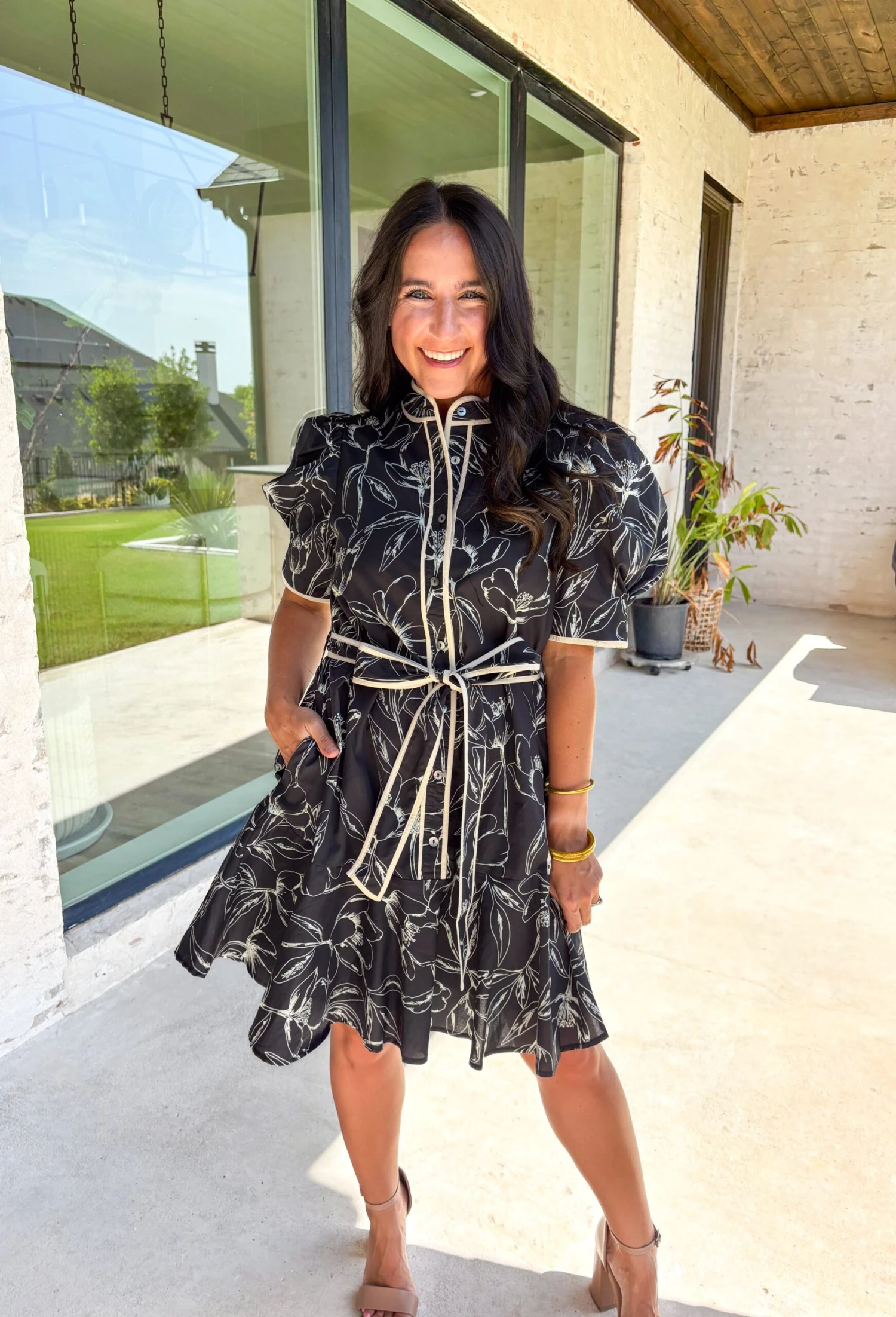 This floral stunner brings timeless charm with a modern twist! Featuring pleated puff sleeves and a playful ruffle hem, it’s designed with fall moments in mind—think pumpkin patch pics or brunch with the girls. The ecru floral print and contrast binding add just the right amount of vintage flair to the black backdrop, while the removable belt lets you customize the fit.
