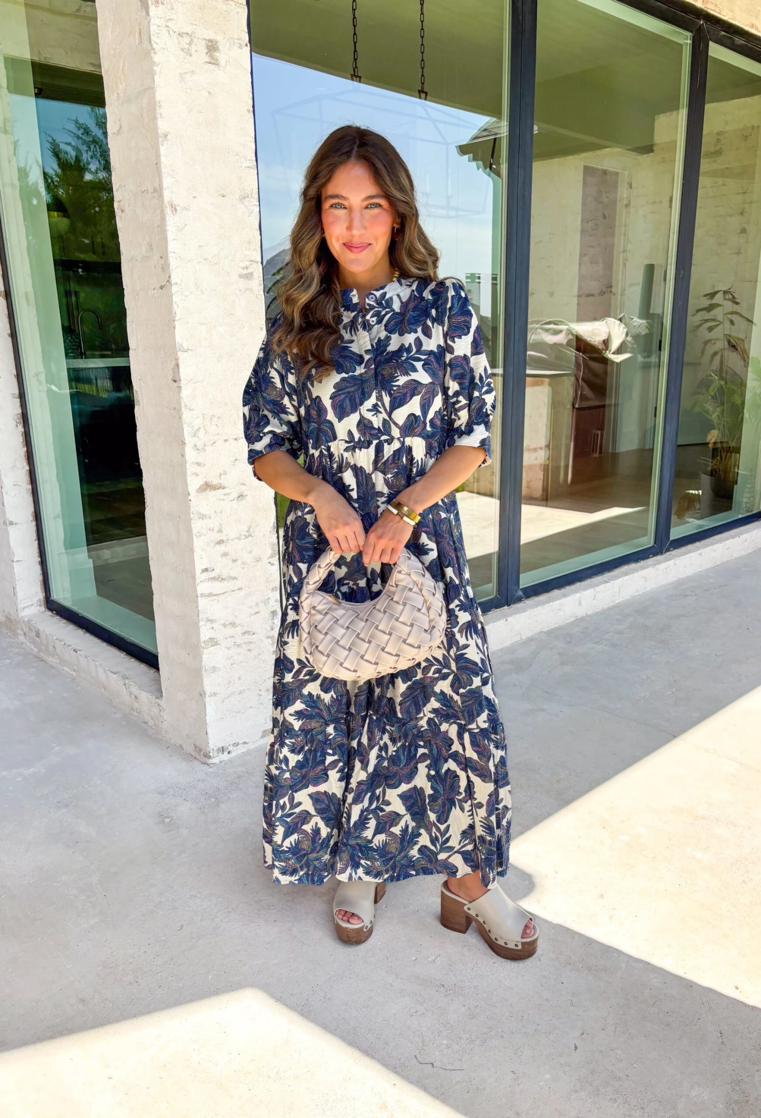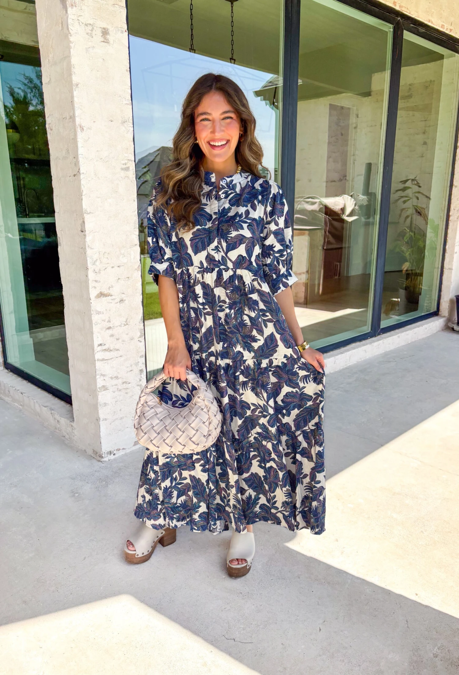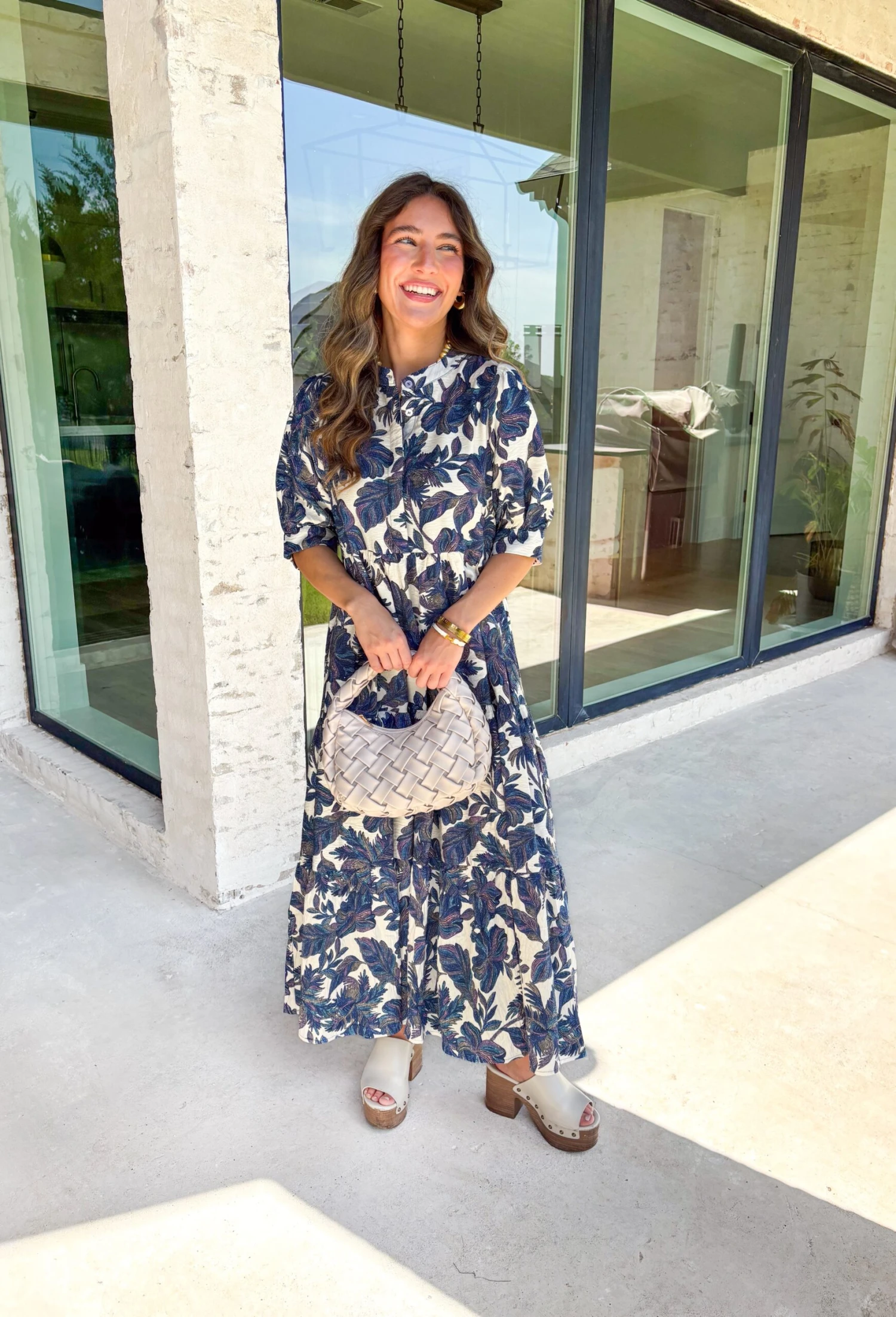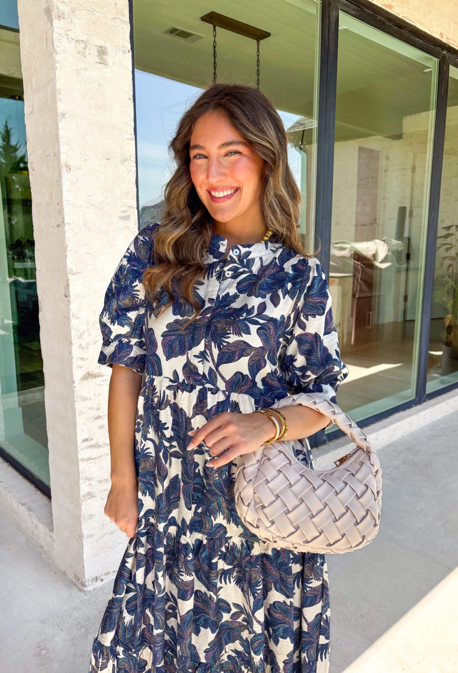 This off-white tiered midi dress is giving all the artsy fall vibes with its colorful abstract print in shades of blue, purple, and tan. The cuffed sleeves and button-front detail add a touch of structure, while the breezy tiered skirt and flattering v-neckline keep things effortlessly chic. Whether you’re strolling through a weekend market or grabbing coffee with friends, this dress is ready to turn heads.