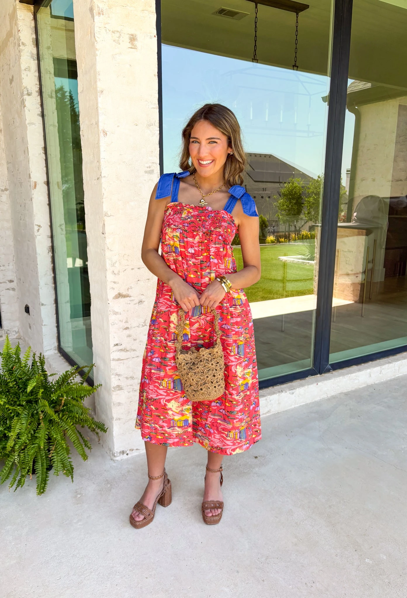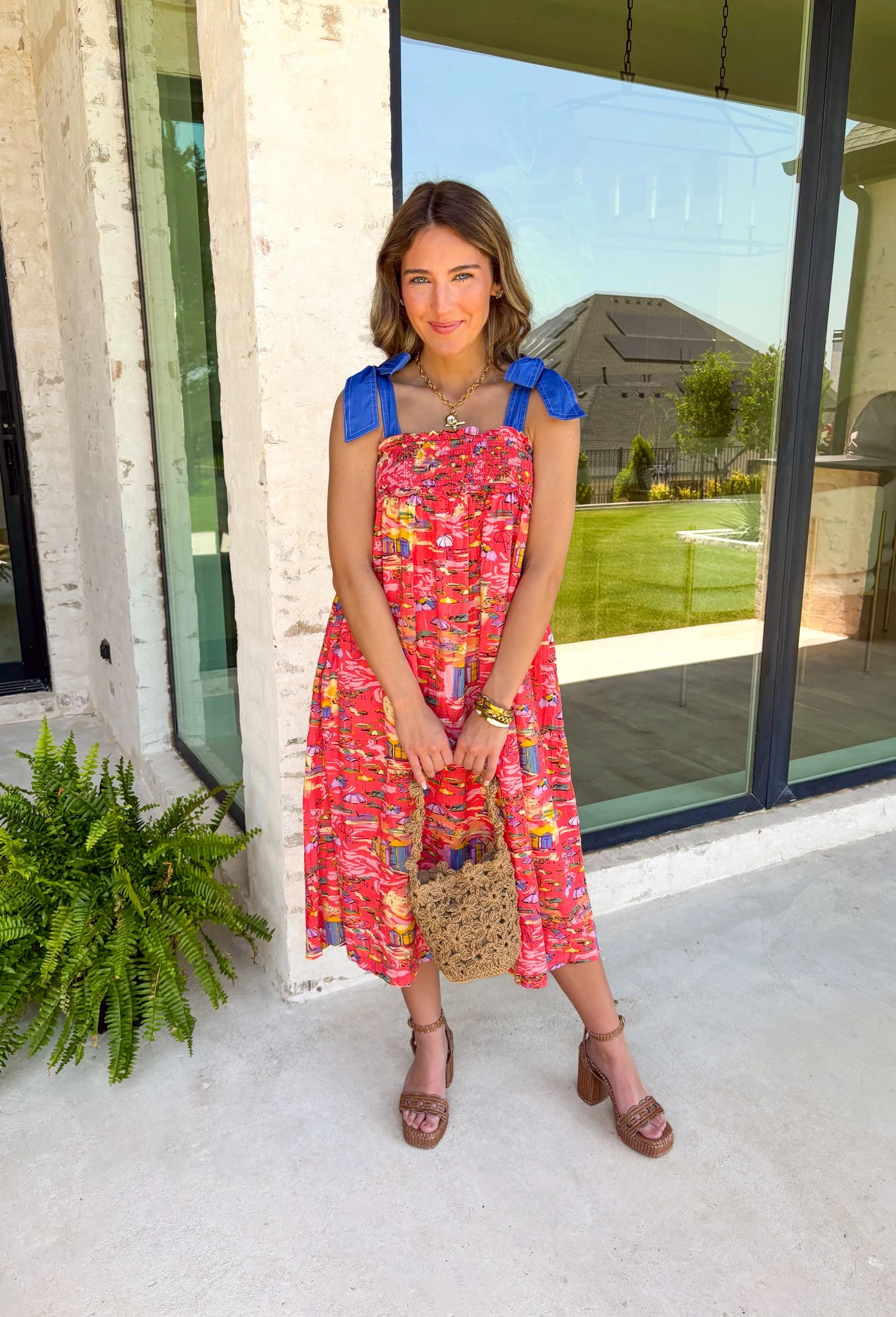 Ready for a vacay vibe? This red sleeveless midi dress is covered in a bold, colorful abstract beach scene print with pops of pink, purple, yellow, orange, and blue for ultimate tropical feels. Featuring a comfy smocked top and adjustable blue tie straps, it’s easy, breezy, and perfect for everything from beach parties to sunset dinners. Fully lined and crafted from a cotton-rayon blend, it’s lightweight and a must-have for your warm-weather wardrobe!