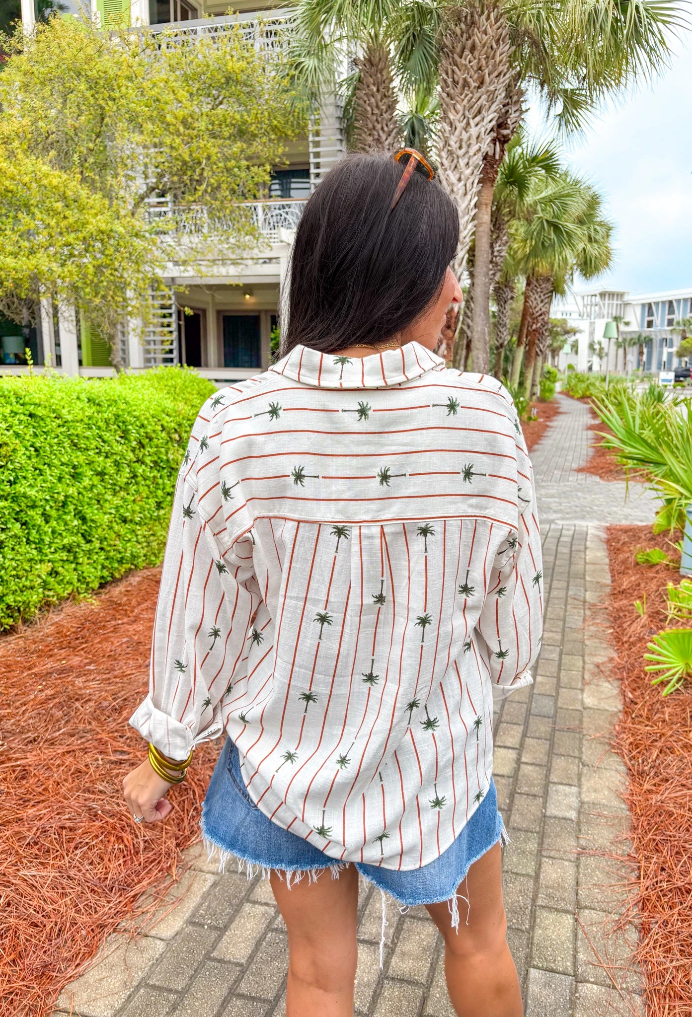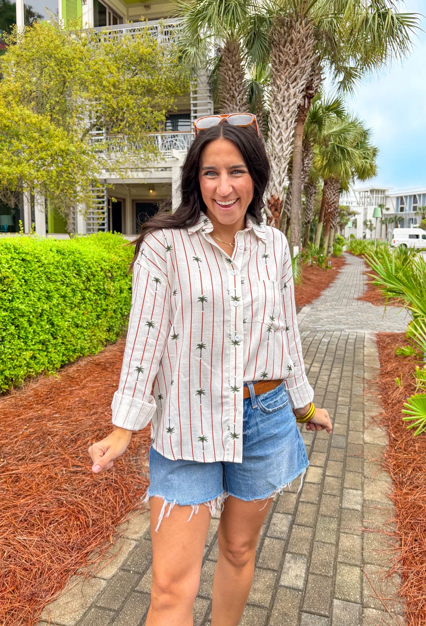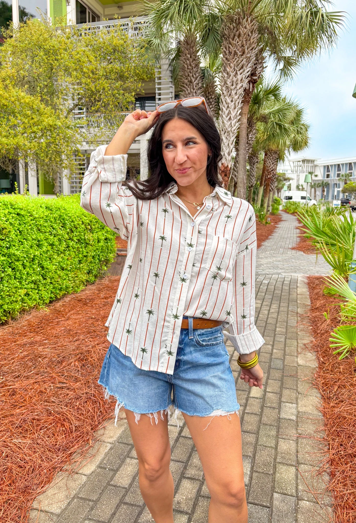 Beach days just got better with this lightweight off-white button down. Featuring a laid-back rust stripe and palm tree print, this top is basically a vacation in shirt form. Made by Gilli in a breezy rayon-linen blend, it’s the perfect piece to toss on over a swimsuit, pair with denim shorts, or tie up for a casual night by the beach.