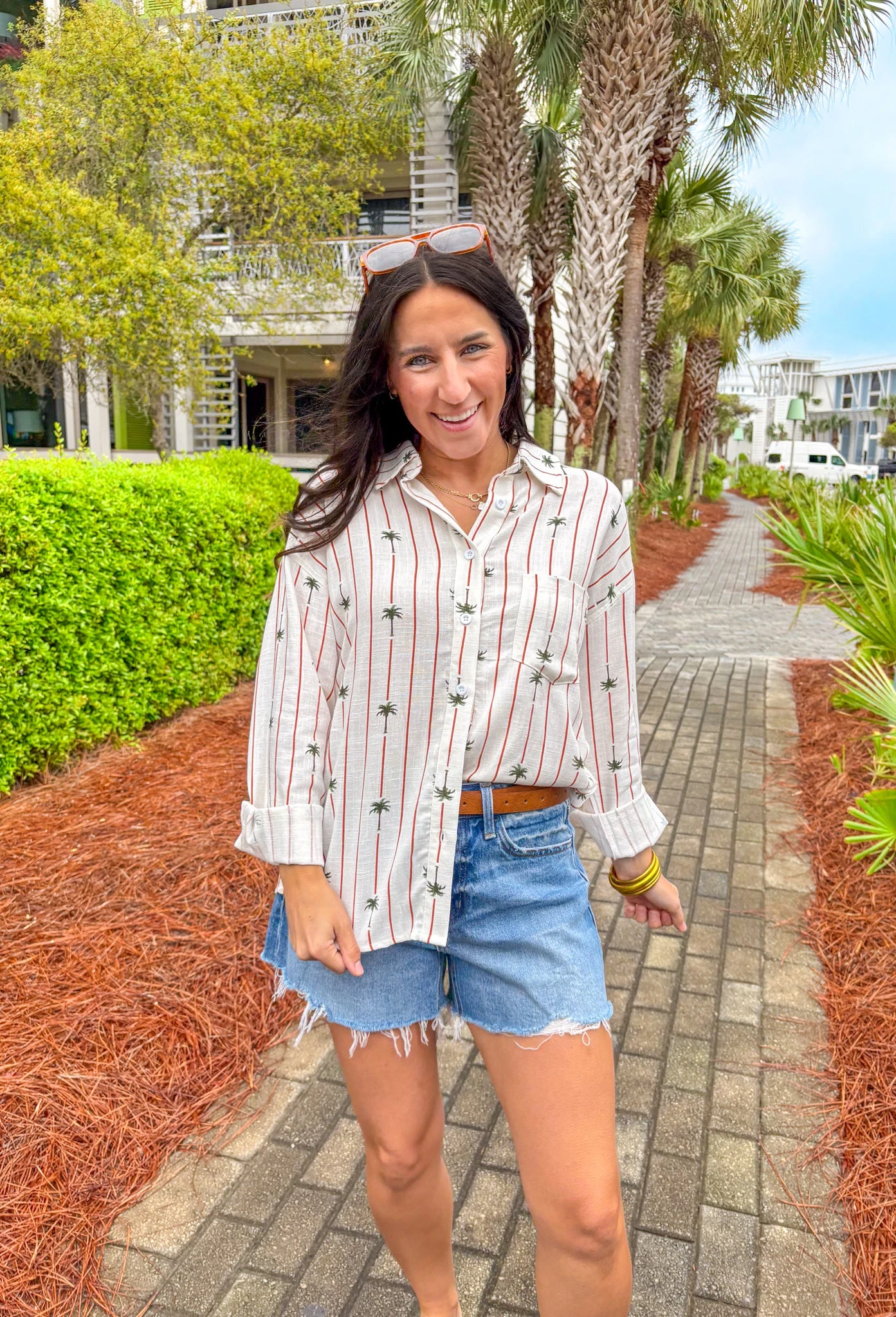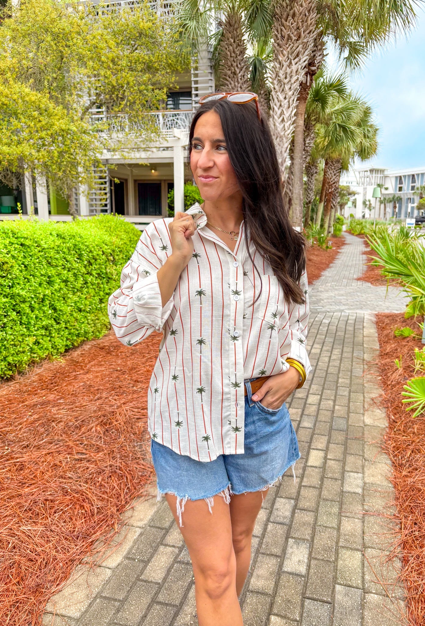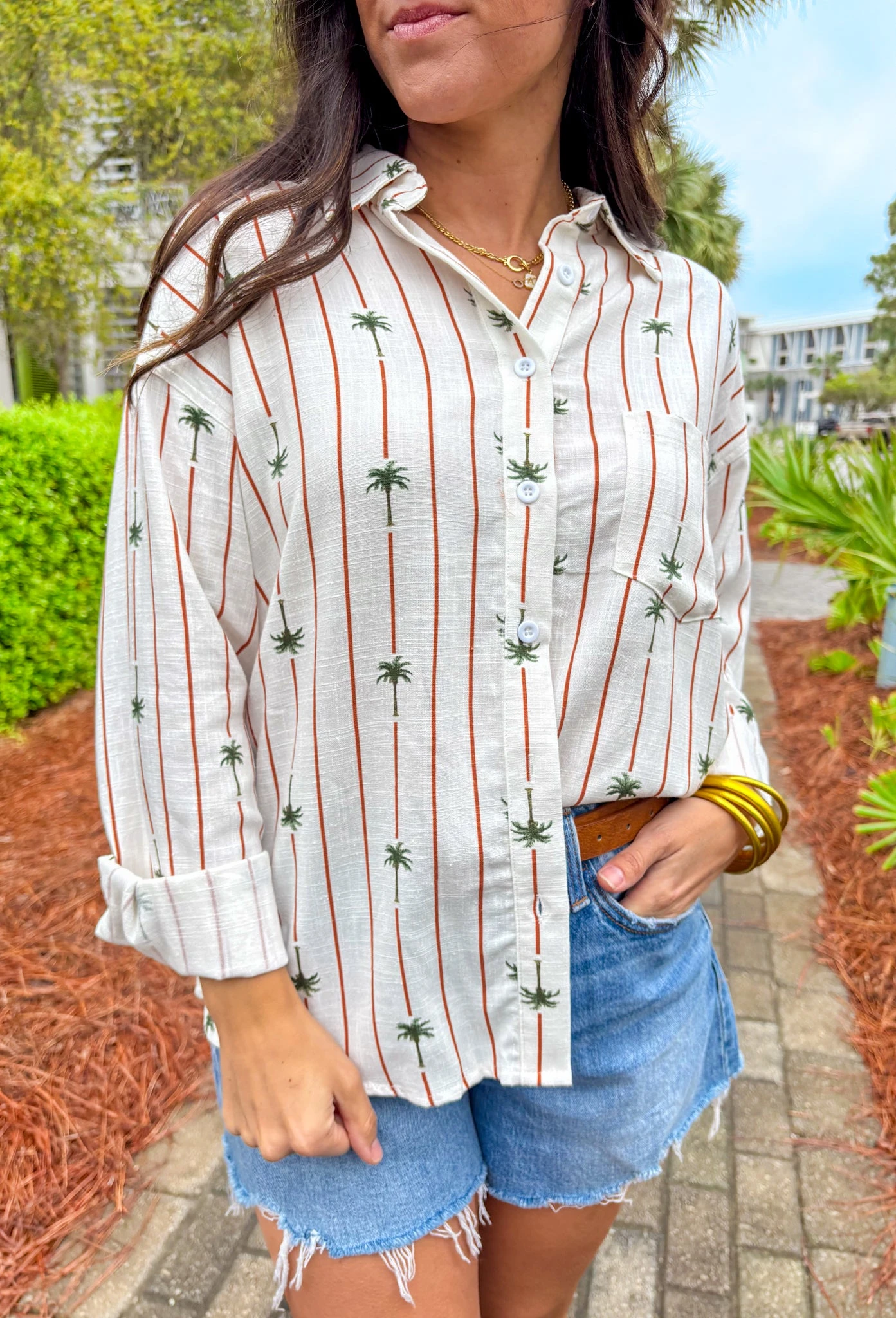 Beach days just got better with this lightweight off-white button down. Featuring a laid-back rust stripe and palm tree print, this top is basically a vacation in shirt form. Made by Gilli in a breezy rayon-linen blend, it’s the perfect piece to toss on over a swimsuit, pair with denim shorts, or tie up for a casual night by the beach.