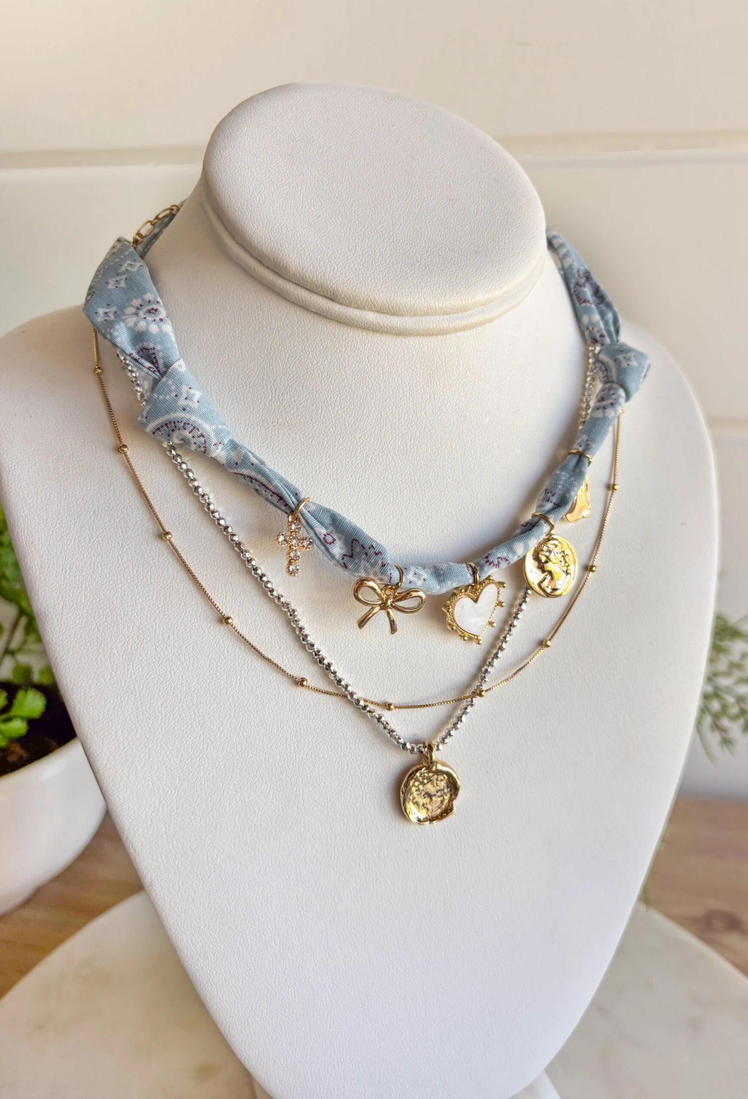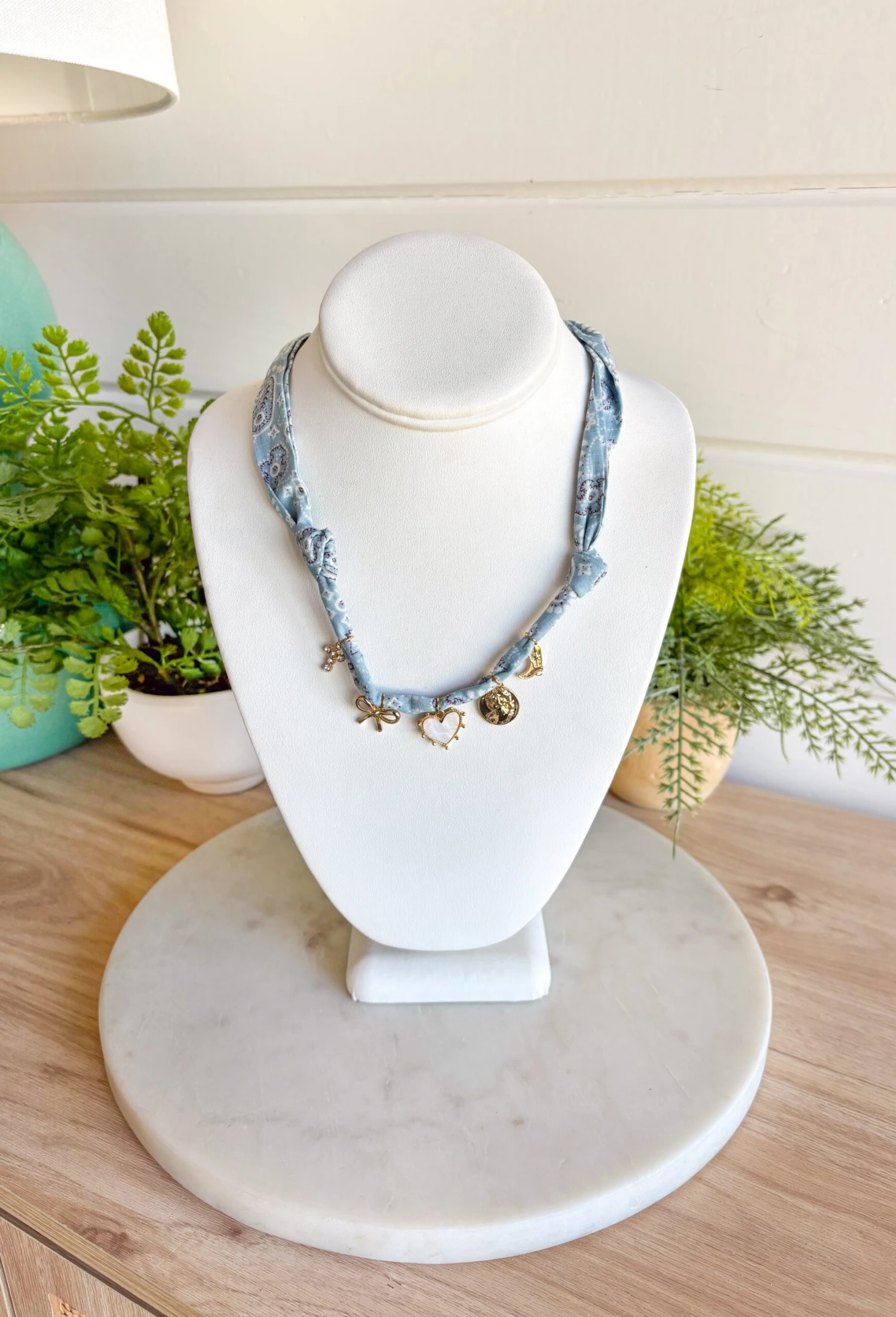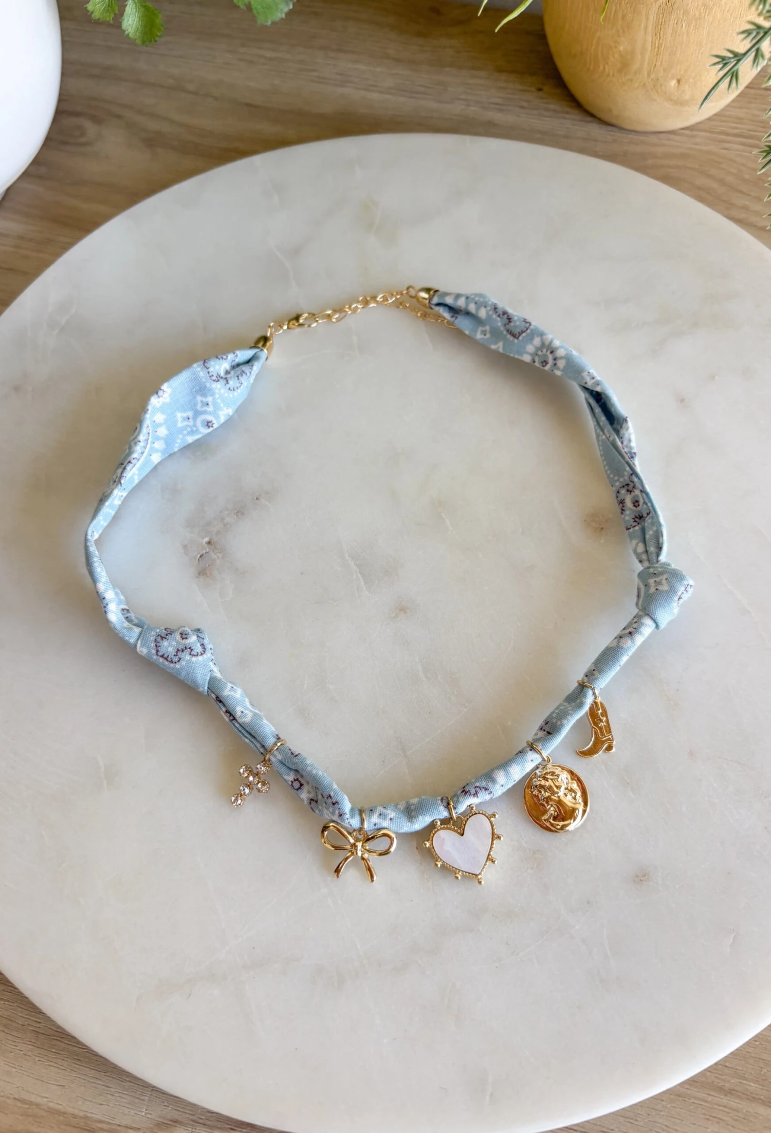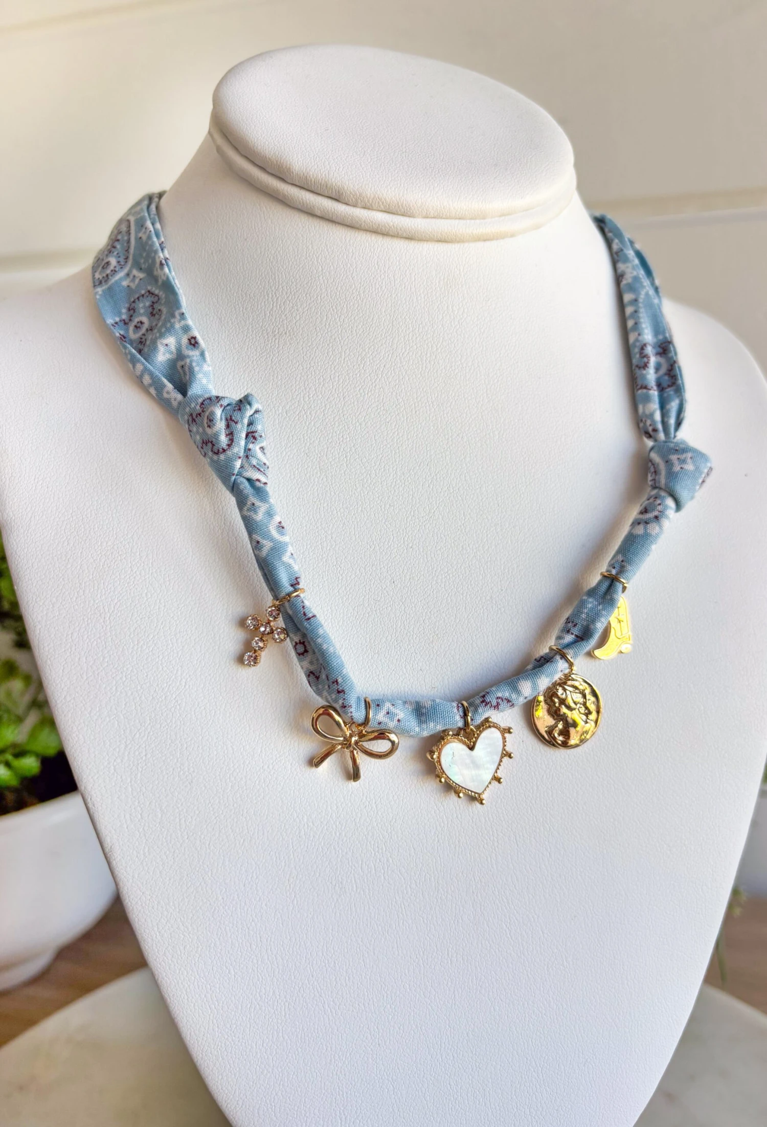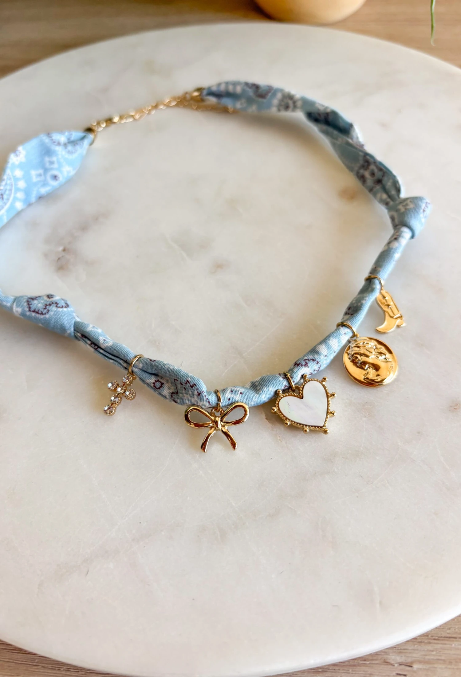- Material: Fabric bandana necklace with mixed charms
