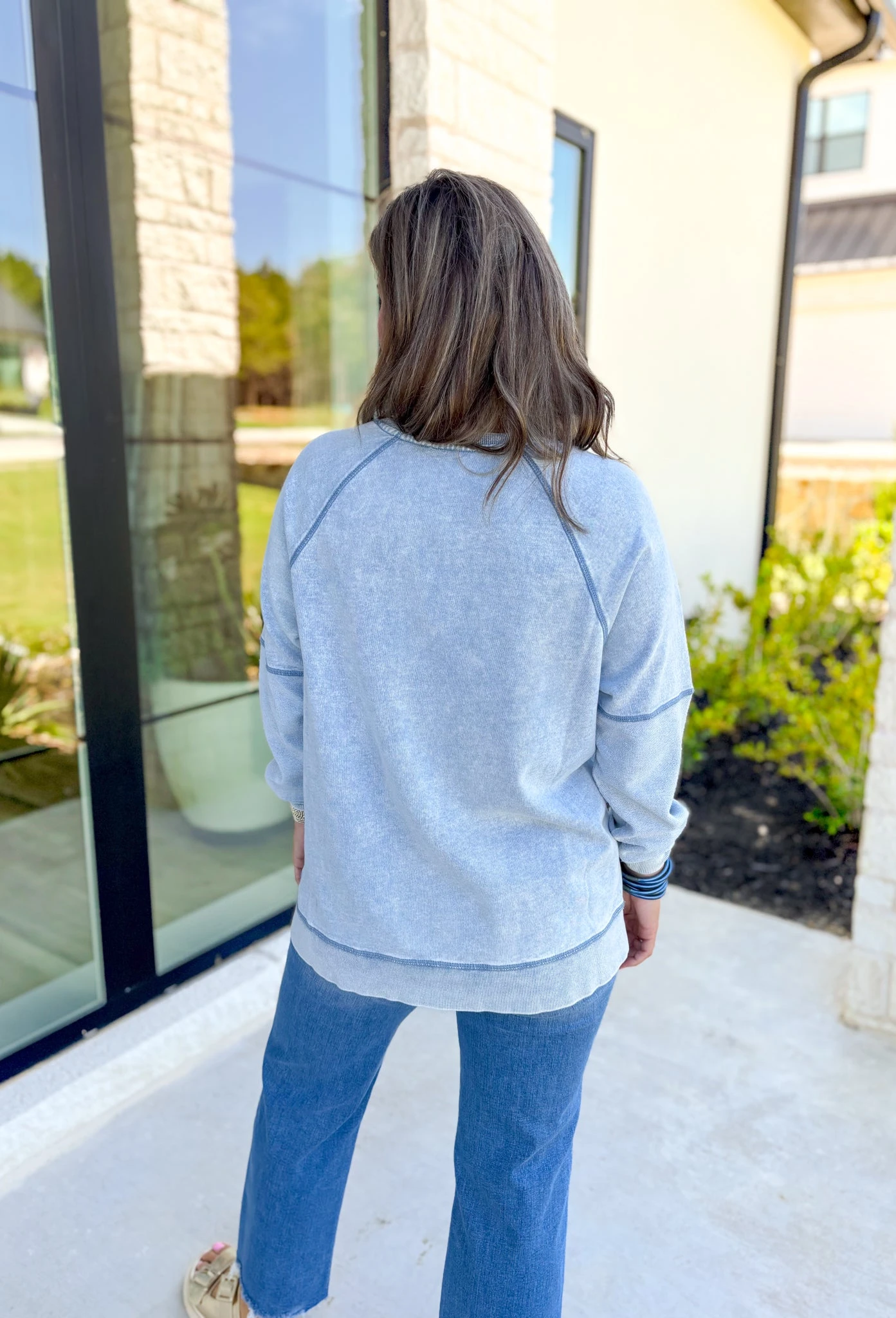 Refresh your casual wardrobe with this v-neck sweatshirt, crafted from midweight knit denim french terry fabric. Featuring exposed seams and contrast fabric details, this top creates a contemporary look no matter how you style it.